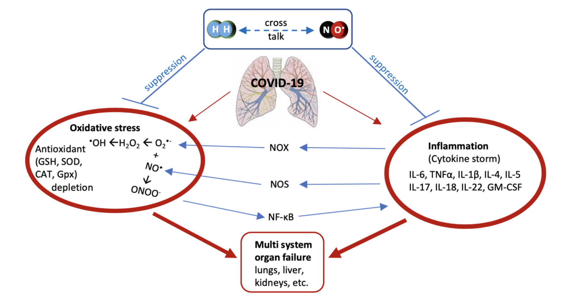 W leczeniu ciężkiej postaci COVID-19 stosuje się kilka leków, w tym tocilizumab i deksametazon. Próbowano również terapii leczenia polegającego na blokowaniu receptora interleukiny 6 (anti-IL6-receptor therapy). Niektórzy badacze odkryli także, że wodór może hamować przenikanie białych krwinek, takich jak neutrofile i makrofagi, do tkanki płuc, a także blokować działanie NF-κB i Mieloperoksydazy (MPO) w tej tkance. Redukuje poziom czynników zapalnych, a także zmniejsza wydzielanie cytokin w tkance płucnej, w tym TNF-α, IL-1, IL-6 i HMGB1. Wodór usuwa również RFT, w tym aniony hydroksylowe i nadtlenoazotynowe oraz przywraca prawidłowy metabolizm antyoksydacyjny.